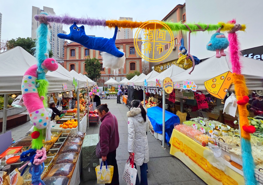 摊位上摆满的各类水果、糖果、手作,给冬日带来丝丝暖意。