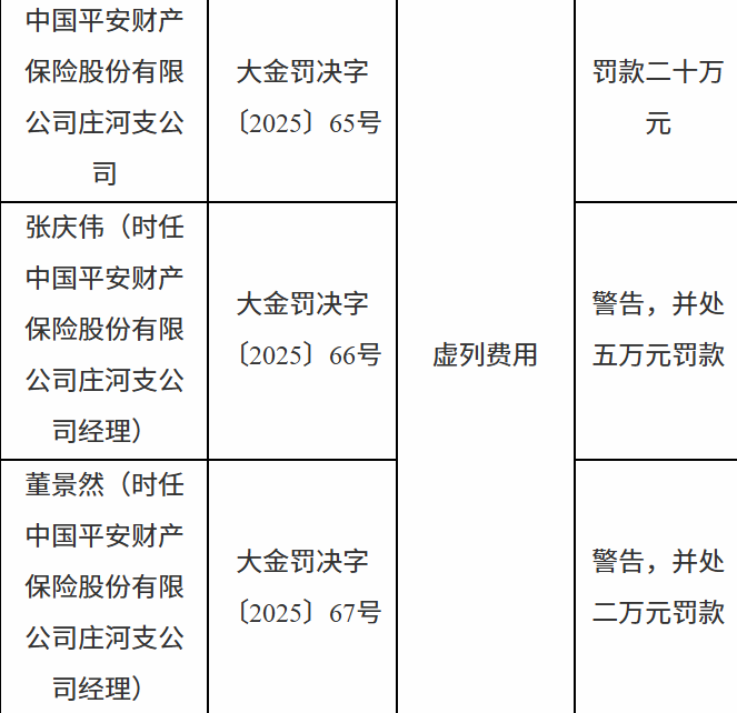 11月25日,国家金融监督管理总局大连监管局行政处罚信息公开表显示,中国平安财产保险股份有限公司庄河支公司因虚列费用被罚款二十万元;张某伟被警告并罚款五万元;董景然被警告并罚款二万元。