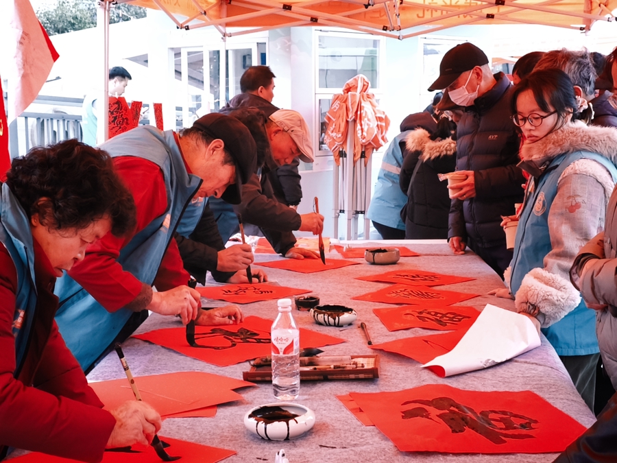 墨香扑鼻的“文明送福”区域,几位书法家和书法爱好者正挥毫书写“福”字。红纸铺展,笔墨酣畅,一幅幅风格各异的“福”字在现场传递。志愿者小张在一旁协助铺纸研墨:“今天能够力所能及地服务市民,传递文明理念,特别有意义。”活动开始一个小时,几百张手写福字就被赠予市民,每一张都承载着诚挚的新春祝愿。市民游客接过现场书写的福字,高兴地说:“这比印刷的更有味道,把福气也带回家。”不少人现场把刚写好的“福”字摊在一旁晾干,成为一道自带“福气”的人文风景。