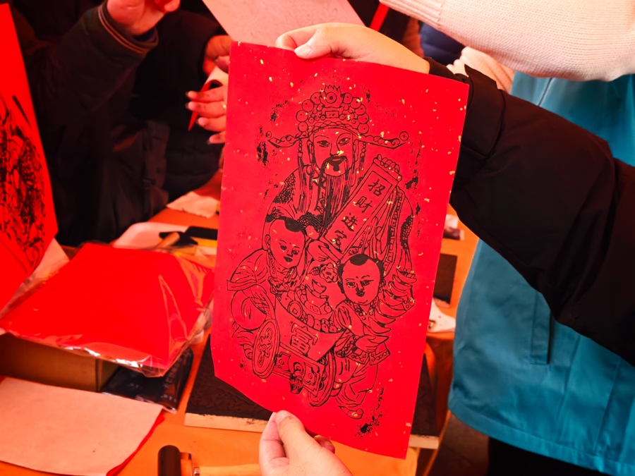 非遗传承区内,“马上有福”和门神、财神等木版年画拓印,引得驻足观看的市民游客把摊位围得水泄不通。“这样的拓印比较少见,不仅好看,还能了解非遗文化。”还有一些市民游客忍不住亲手尝试,在志愿者的指导下,铺纸、刷墨、拓印,制作出一张张寓意吉祥的版画。